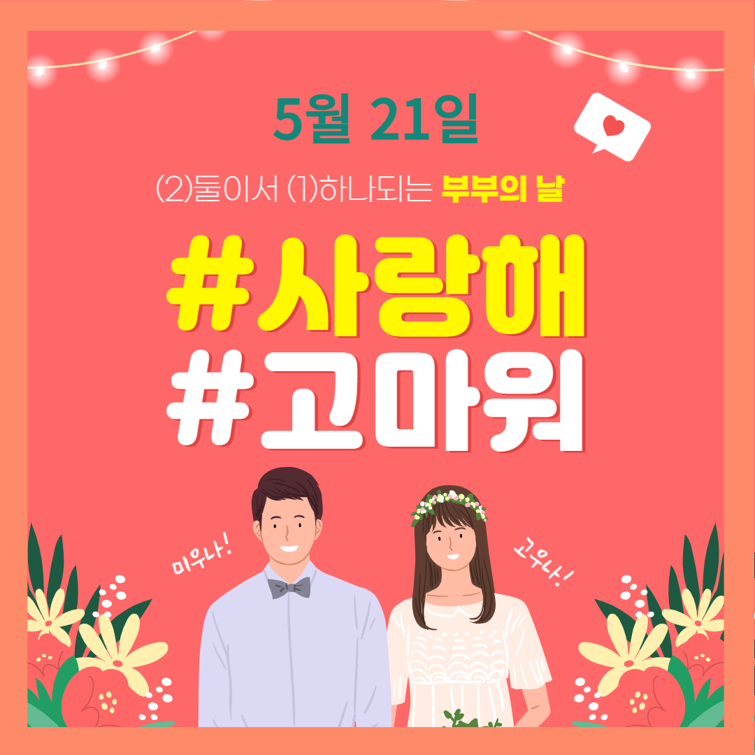 매년 5월 21일은 부부의 날입니다. 여성가족부 주관으로 건전한 가족 문화의 정착과 가족해체 예방을 위한 행사를 개최하는 대한민국 법정 기념일입니다.